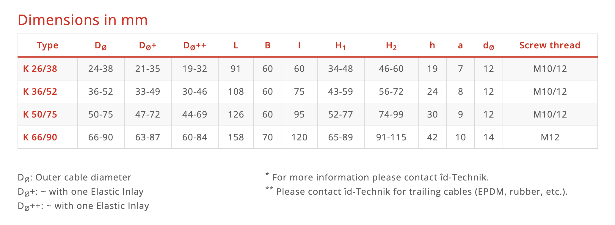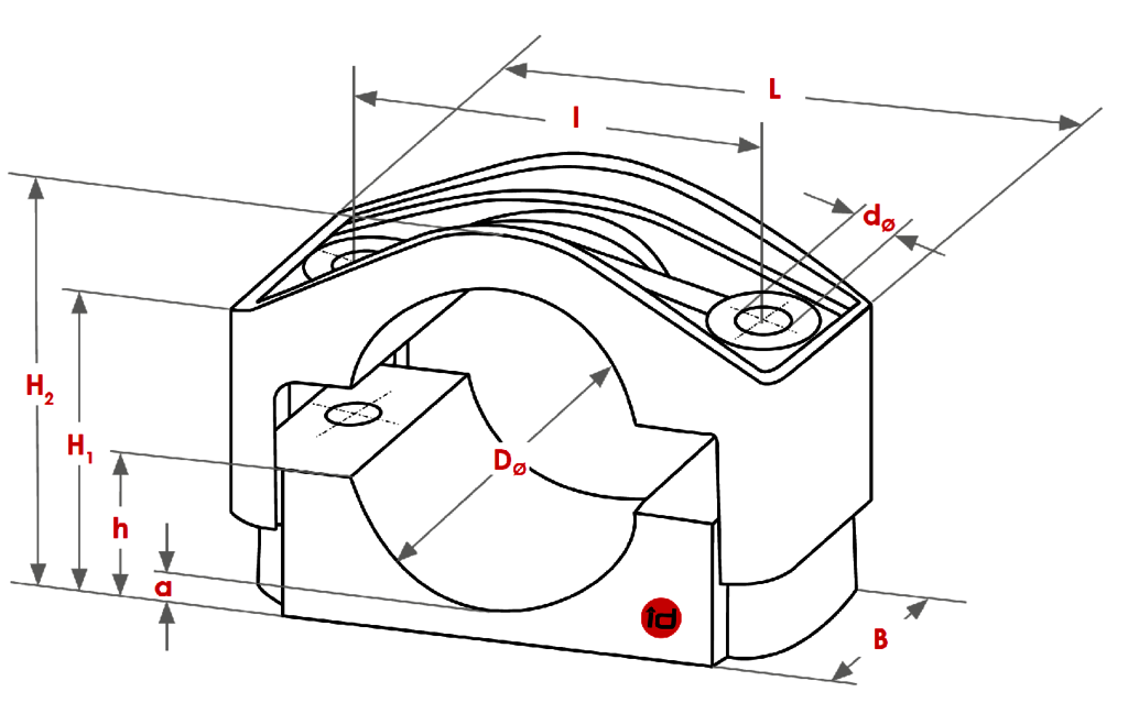 The id‑Technik K Series cable clamps are heavy-duty, fibreglass-reinforced polyamide clamp fittings designed to secure single- and multi-core cables (indoor or outdoor) with outer diameters from 19 mm up to 90 mm.