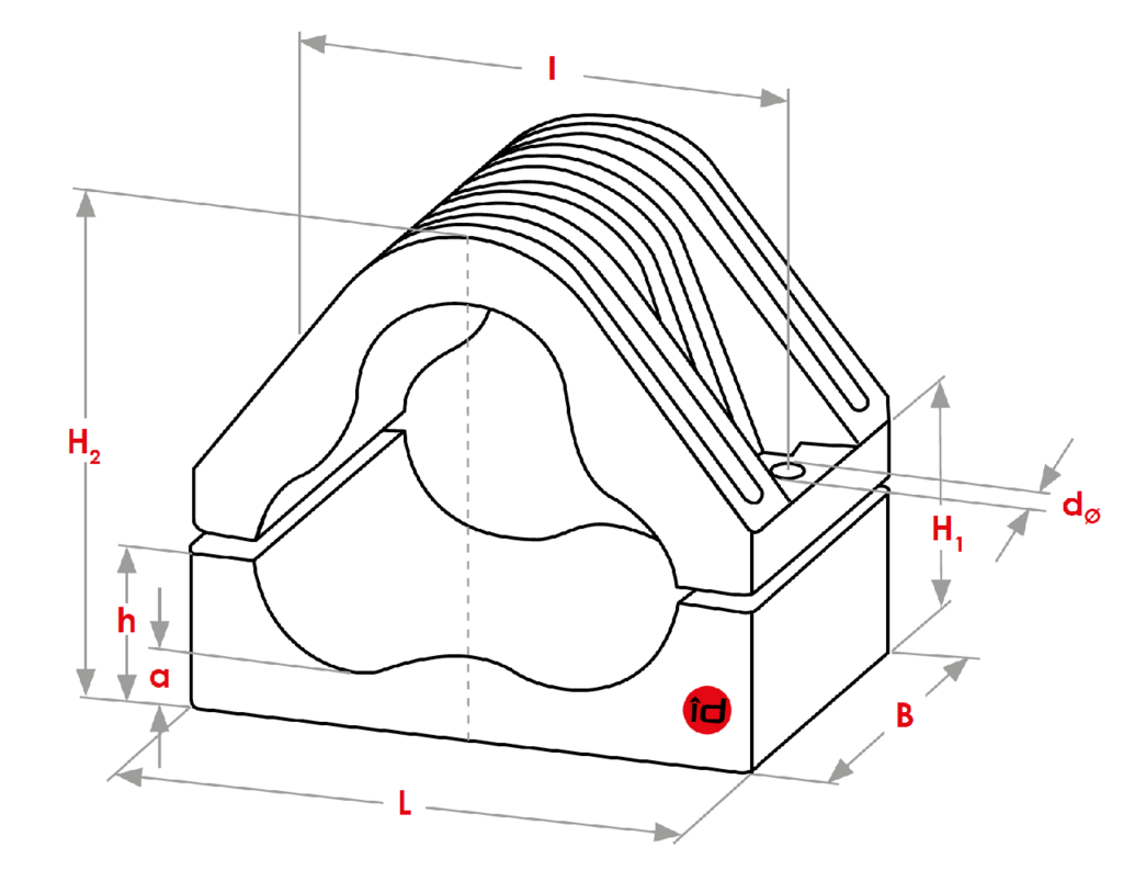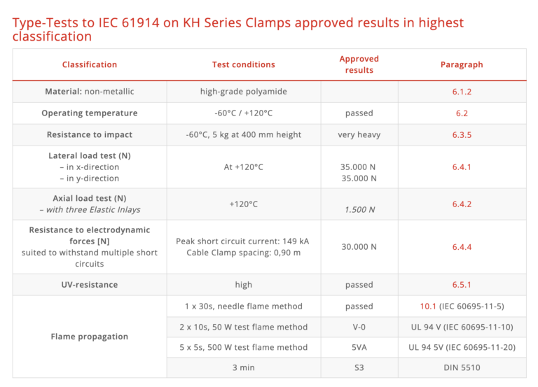 The KH Series clamps are heavy-duty, fibre-glass reinforced polyamide clamps designed for trefoil formation of single- and multi-core cables indoors or outdoors — suitable for harsh environments (UV, ozone, oils, salts, chemicals, extremes of temperature). They accommodate cable outer diameters from ≈ 59 mm up to 165 mm.