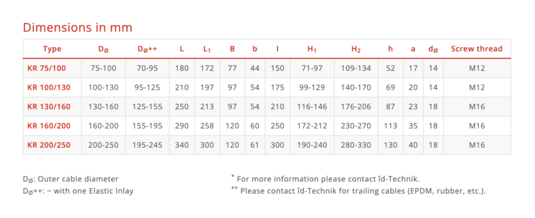 The KR Series clamps are heavy-duty, fibreglass-reinforced polyamide clamps designed for fastening large single- or multi-core cables (indoors or outdoors) under very high stress conditions. They support cables with outer diameters ranging from 70 mm up to 250 mm. The clamps deliver a dynamic resistance to short-circuit forces of 30,000 N, ensuring safe restraint even under high fault-current events or multiple short circuits.