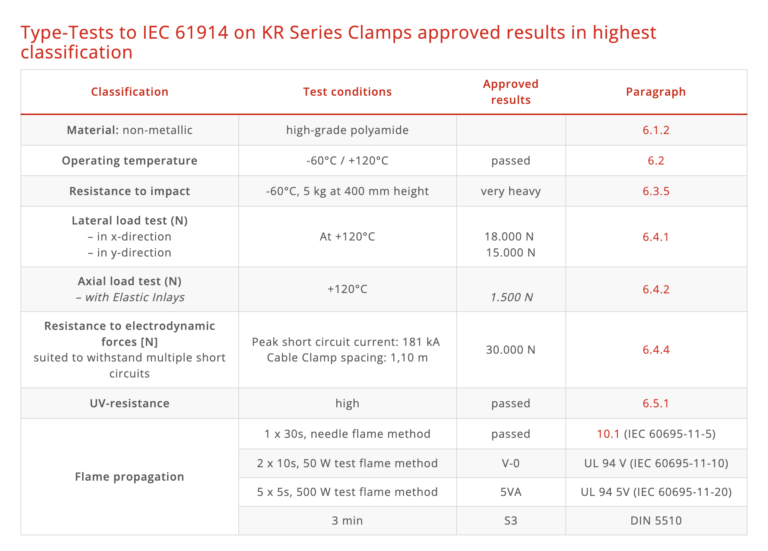 Built from non-metallic, UV-resistant, flame-retardant, low-smoke, zero-halogen polyamide, KR clamps resist extreme environments: UV exposure, ozone, oils, fuels, salts, alkalis, solvents, and even harsh climatic conditions (desert, coastal, arctic, etc.). They are rated for continuous operation between –60 °C and +120 °C, with short-term tolerance up to +220 °C.