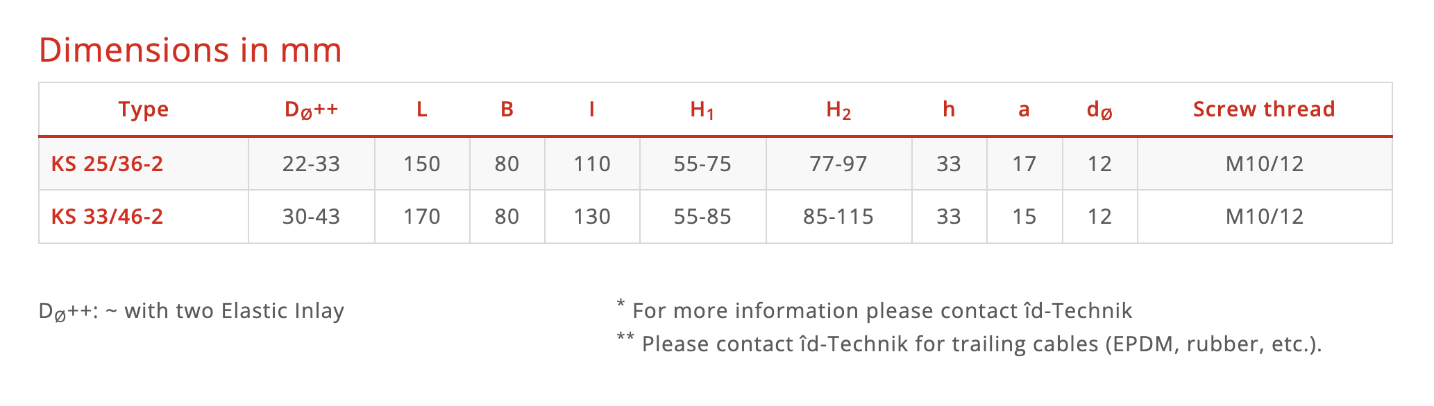 The KS Series EE clamps are robust, fibreglass-reinforced polyamide clamps (non-metallic, UV-protected, self-extinguishing, low-smoke/zero-halogen) designed to secure single- and multi-core cables in trefoil or stacked configurations — suitable for both indoor and outdoor use. They accept cable outer diameters from about 22 mm up to 43 mm when elastic inlays are used.
