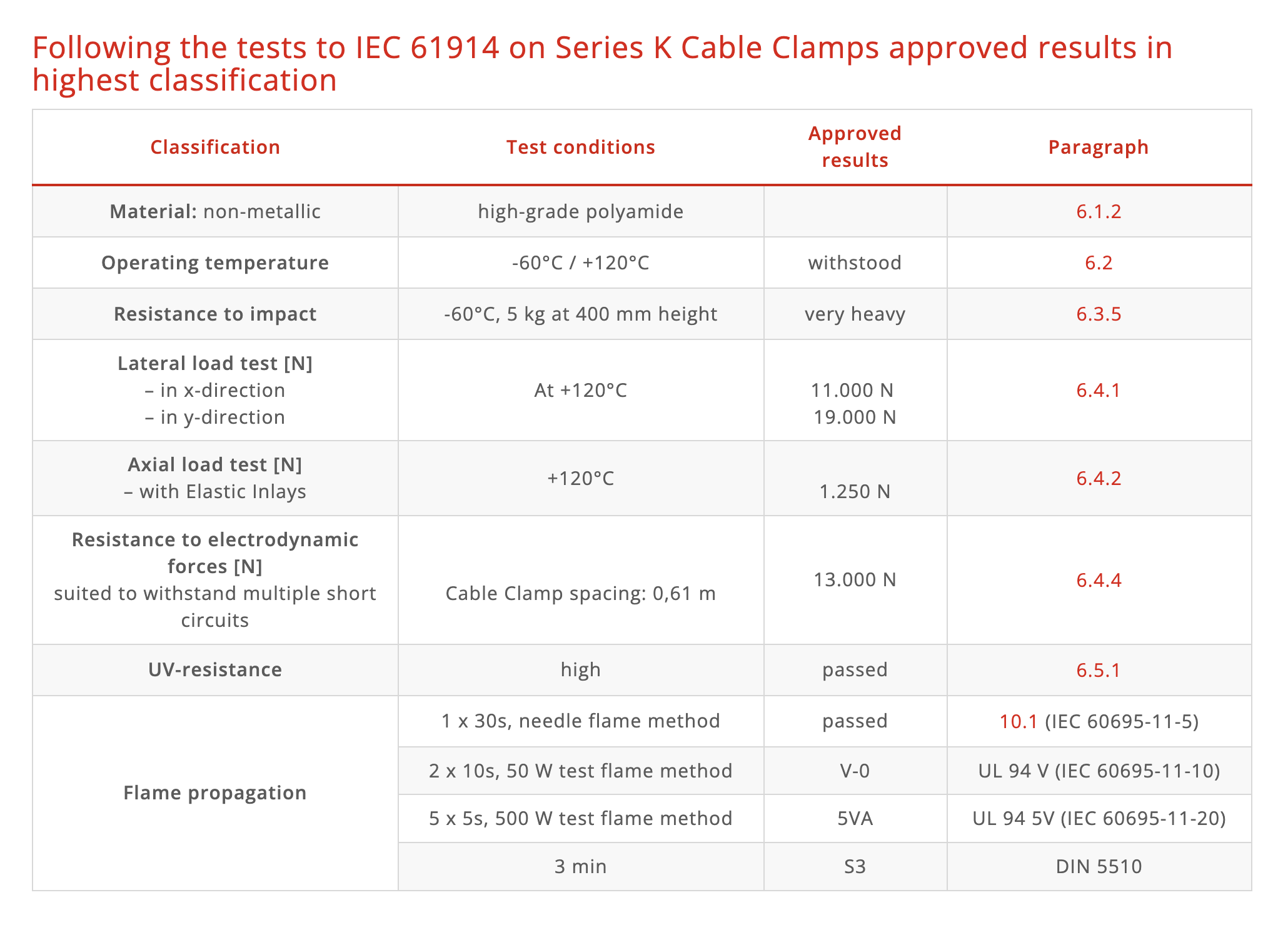 The clamps are rated for a dynamic short-circuit force resistance of 13,000 N, offering secure retention under high electrical stress, with material strength (tensile: 120 N/mm²; flexural: 210 N/mm²) and a wide operating temperature range from –60 °C to +120 °C (with short-term tolerance up to 220 °C).