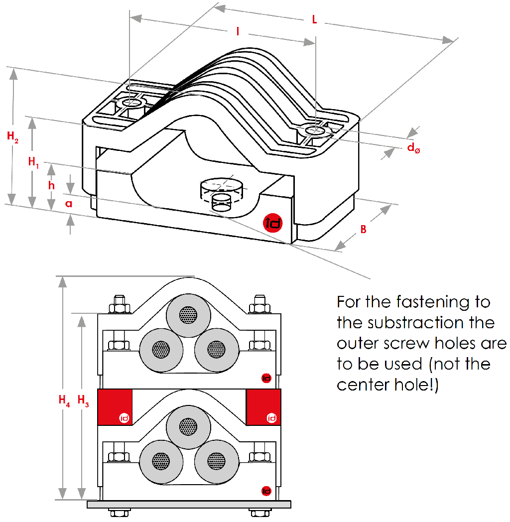 The “Tower + Adapter Set” design means each unit includes two full clamps plus a universal adapter set — enabling stacked or double-clamp configurations for efficient cable layout, especially when space or trefoil/stacked grouping is needed. Installation requires fastening screws (thread M10/M12) with tightening torques: bottom part ~ 15 Nm, other parts ~ 5 Nm.