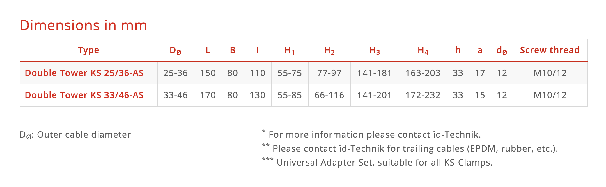 The KS-Tower Series with Adapter Set is a non-metallic, fibreglass-reinforced polyamide clamp system for trefoil or stacked fastening of single- or multi-core cables, suitable for indoor or outdoor use under harsh environmental conditions (UV, ozone, oils, salts, chemical exposure, etc.). It covers cables with outer diameters from 25 mm to 46 mm. The material is flame-resistant (UL94 5VA / V-0 compliant), low-smoke, zero-halogen (LSZH), self-extinguishing, recyclable, non-magnetic and non-corrosive.